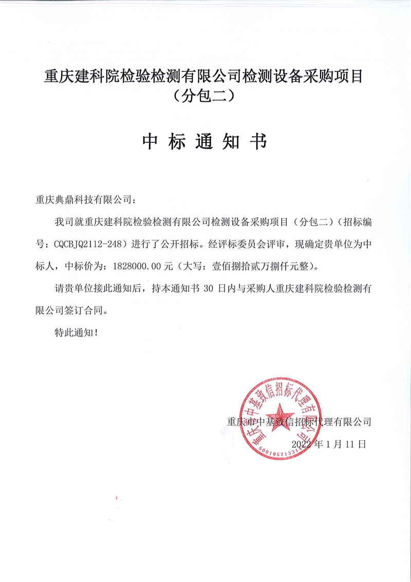 重慶建科院檢驗檢測有限公司委托重慶市中基致信招標代理有限公司對我公司檢測設備采購項目(項目號:CQCBJQ2112-248 )分包一(力學)和分包二(化學)進行了公開招標采購,現已完成全部采購程序。確認重慶展宇儀器設備有限公司為分包一(力學)中標人,中標價為2305000元(貳佰參拾萬伍仟佰元整)。確認重慶典鼎科技有限公司為分包二(化學)中標人,中標價為1828000元(壹佰捌拾貳萬捌仟元整)。
