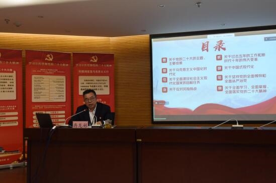 冉龍彬同志從深刻把握黨的二十大的重大意義,深刻把握過去5年的工作和新時代10年的偉大變革,深刻把握譜寫馬克思主義中國化時代化新篇章的歷史責(zé)任,深刻把握以中國式現(xiàn)代化推進(jìn)中華民族偉大復(fù)興的使命任務(wù),深刻把握全面建設(shè)社會主義現(xiàn)代化國家的目標(biāo)任務(wù),深刻把握以偉大自我革命引領(lǐng)偉大社會革命的重要要求,深刻把握關(guān)于發(fā)揚(yáng)斗爭精神、應(yīng)對風(fēng)險挑戰(zhàn)的重要要求,全面學(xué)習(xí)、全面把握、全面落實(shí)黨的二十大精神8個方面,對黨的二十大精神進(jìn)行了全面系統(tǒng)深入的宣講解讀。