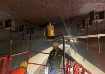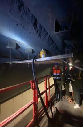 該項(xiàng)檢測(cè)工作時(shí)間緊、任務(wù)重,檢測(cè)操作難度較大。為了更好地完成檢測(cè)工作,公司立即組織相關(guān)人員成立專項(xiàng)技術(shù)小組并召開技術(shù)論證會(huì),隨后及時(shí)安排人員開展現(xiàn)場(chǎng)檢測(cè)工作,由于該隧道交通通行壓力較大,檢測(cè)工作選擇在晚上10點(diǎn)后進(jìn)行,并協(xié)調(diào)重慶市渝中區(qū)交警支隊(duì)進(jìn)行交通導(dǎo)行,在移動(dòng)吊車、自卸式起重車等多種特種作業(yè)設(shè)備的支持下,爭(zhēng)分奪秒,于凌晨3點(diǎn)順利完成了風(fēng)機(jī)吊架承載力檢測(cè)工作。