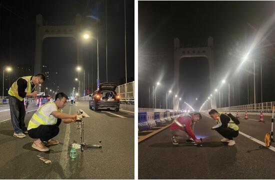鵝公巖長江大橋是重慶主城區(qū)橫跨長江連接九龍坡區(qū)和南岸區(qū)的重要特大橋梁,是快速抵達(dá)成渝高速和渝黔高速的主要通道,大橋為雙向八車道,于2000年12月建成通車。近年來,隨著車流量急速增長及重車通行,橋面瀝青鋪裝層產(chǎn)生較多病害,可能影響使用壽命。為全面掌握橋面鋪裝層病害狀況,檢測中心選派豐富經(jīng)驗的檢測人員提前收集項目資料,協(xié)商交通組織方案并編制檢測方案,保證任務(wù)順利開展。全體檢測人員高度重視夜間工作的安全問題,布設(shè)大量交通導(dǎo)行標(biāo)牌、施工限速標(biāo)志等交通設(shè)施,全員穿反光背心、佩戴安全警示燈進(jìn)行病害分布、平整度、摩擦系數(shù)、構(gòu)造深度等指標(biāo)的檢測,確保數(shù)據(jù)的真實性和準(zhǔn)確性。最終檢測數(shù)據(jù)和狀況評估以報告編制工作會的形式發(fā)布,為鋪裝層病害專項整治專項設(shè)計提供了技術(shù)依據(jù),為后續(xù)的橋面鋪裝層病害整治方案制定提供了科學(xué)支撐。