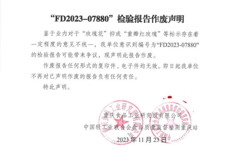 鑒于業(yè)內(nèi)對(duì)于“玫瑰花”抑或“重瓣紅玫瑰”等標(biāo)示存在著一定程度的意見不統(tǒng)一,我單位意識(shí)到編號(hào)為“FD2023-07880”的檢驗(yàn)報(bào)告可能帶來爭議,現(xiàn)聲明此報(bào)告作廢。