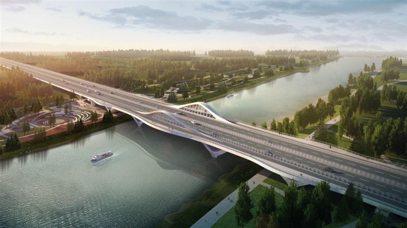 主橋設(shè)計采用梁-拱型組合體系,立意“荷香”,將荷葉形態(tài)融入到橋梁造型當(dāng)中,荷葉浮于運(yùn)河之上,整個造型宛如運(yùn)河上盛開的荷花,生態(tài)自然,與環(huán)境融為一體,給人以生機(jī)盎然、自然和諧的美感。