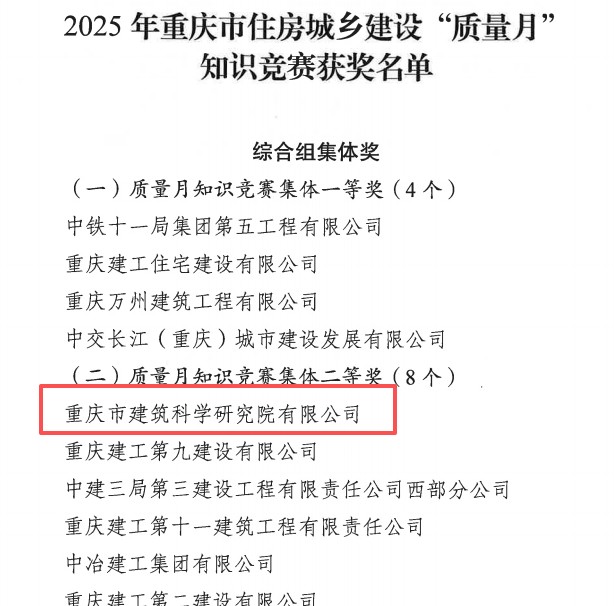 近日,重慶設(shè)計集團(tuán)所屬子企業(yè)重慶市建筑科學(xué)研究院有限公司(以下簡稱“市建科院”)在參加重慶市住房和城鄉(xiāng)建設(shè)工程質(zhì)量安全總站、重慶市建設(shè)工程質(zhì)量協(xié)會組織開展的2025年重慶市住房城鄉(xiāng)建設(shè)“質(zhì)量月”知識競賽中,榮膺3項集體獎、8項個人獎。